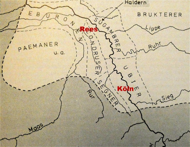 Die Sugambrer waren auf der rechten Niederrheinseite gefürchtete Feinde der Römer und wurden unter Augustus durch Drusus um 8 v. Chr, besiegt und zum großen Teil auf die linke Rheinseite umgesiedelt.