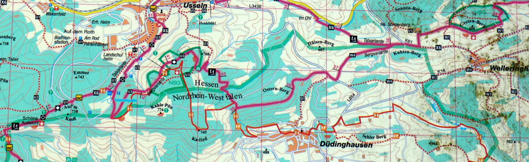 Heutiger Grenzverlauf zwischen Hessen und Nordrhein Westfalen. Foto: Wolfgang Wilhelmi, Übersichtskarte an der Diemelquelle