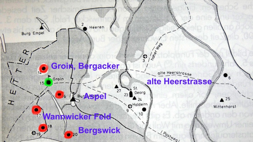 Einen weiteren Hinweis liefern Ausgrabungen, die um 1850 von einem Rektor Boering, durchgeführt wurden. Er fand um die Siedlungen herum fränkische Gräberfelder. Die Bedeutung der Anlage wird noch durch den Verlauf der damaligen alten Heerstrasse gesteigert. Sie führte unmittelbar an der ländlichen Urbanisation vorbei. Auch die Ackerfunde lassen den Rückschluss auf eine lange, ständig durchgehende Besiedlung bis ins 10. Jh. zu. Solch ein bedeutender Ort wurde mit zunehmender Zeit, seiner Verteidigungsaufgabe nicht mehr gerecht. Etwa im 9-10 Jh. hat man laut Reichmann eine neue Burg, ganz in der Nähe errichtet. Auf einem mit Wasser umgebenen, mit dem Schutt aus der nahen Colonia Trajana künstlich angelegten Hügel, erbaute der Graf von Aspel und Heimbach, Richizo mit seinem Sohn Godizo zum Ende des 10 Jh. eine wehrhafte Steinburg und ersetzte so die Anlage von Groin. Die Erbauer waren wohl Nachfahren des Hattuarierstammes und standen zum höchsten Adel im Reich bis hin zu Kaiser Heinrich III. in familiären Verhältnissen. Über die um das Jahr 1000 stattfindenden Machtkämpfe des Niederrheinadels um Aspel mit dem Bischof von Utrecht im Bunde mit dem Edelherrn Balderich, hat uns der Mönch Albert von Metz Aufzeichnungen hinterlassen. Diese damaligen Ereignisse, auch um die Tochter von Godizo, Irmgardis von Aspel, sind ganz besondere Geschichten aus dem Hattuariergau. Um das Jahr Tausend erwies sich die Wasserburg als uneinnehmbare Festung. Heute ist nur noch der Burghügel zu sehen. Auch die Vorläuferburg in Groin ist verschwunden. Der alte Ort hieß damals noch nicht Groin, vielleicht hieß er aber schon Aspel oder Aspola. Die alte Burg wurde nach und nach von der Natur überwuchert und geriet in die Vergessenheit. Es ist grün (groin) darüber gewachsen. Etwa 200 Jahre später führten neue bauliche Aktivitäten auf dem Areal allmählich zur Entstehung eines neuen Ortes mit dem Namen Groin.